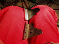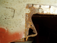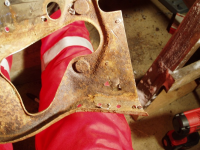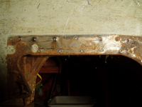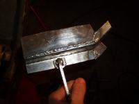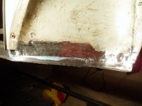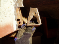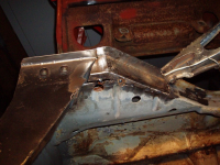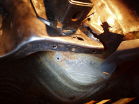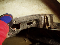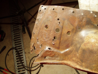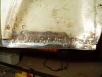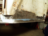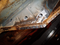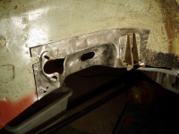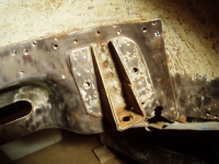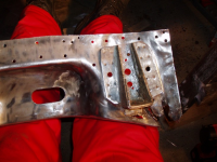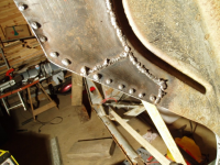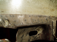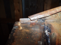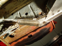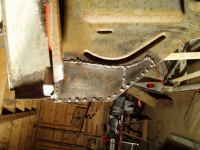 Plata var klar så eg begynte å sveise den fast,, heldigvis var eg ikkje komt lenger enn til punktinga då eg oppdaga noko vesentleg! Avstanden frå skrueholet i kanalen til knekken i plata var ikkje lik orginalen!! Den var faktisk 1cm lenger ut! Så då sjekka eg på napoleonshatten på botnplata og jaudå, med knekken 1cm for langt ut, så ville den havne midt i "oppoverbakken" på hatten. Med andre ord, karosseriet hadde kvilt på knekken og ikkje komt langt nok ned! Forbanna.. men eg måtte saga ut igjen plata og fiksa den.
