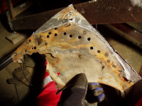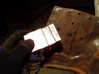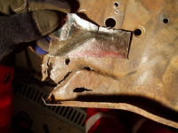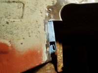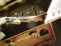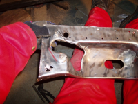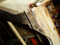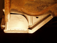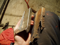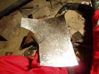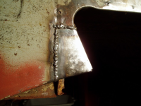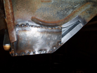Plata var klar så eg begynte å sveise den fast,, heldigvis var eg ikkje komt lenger enn til punktinga då eg oppdaga noko vesentleg! Avstanden frå skrueholet i kanalen til knekken i plata var ikkje lik orginalen!! Den var faktisk 1cm lenger ut! Så då sjekka eg på napoleonshatten på botnplata og jaudå, med knekken 1cm for langt ut, så ville den havne midt i "oppoverbakken" på hatten. Med andre ord, karosseriet hadde kvilt på knekken og ikkje komt langt nok ned! Forbanna.. men eg måtte saga ut igjen plata og fiksa den.