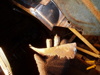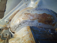 Even more.. Etter eindel boring så vart den største elendigheiten på denne sida av innerskjermane kappa ut..Synst det var overaskande lite rust på falsen, Kittet har ivertfall hjelpt litt, på innsido.