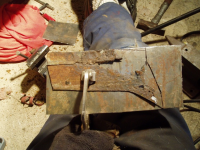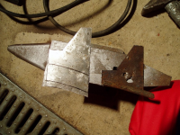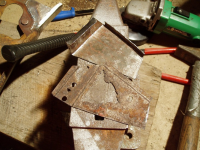 P1016422.jpg (130.49 KB. 733x550 - vist 387 ganger.) For å laga den underste plata så banka eg orginalen flat og brukte då den som mal, så merke opp litt og setta i skrustikka for så å banke til rette vinklene.