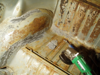 P1016646.jpg (173.22 KB. 733x550 - vist 321 ganger.) Her er eit bilde av rusta hittil i den filt-pylse-kanalen under bakruta.. Heile kanalen er halvfull med rustflak så stålet er nok eindel redusert nedi der..