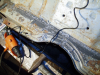 Her var det solid tysnad ja.... Men no er det snart slutt på årets xmas(Xtremt Mas) Og jolafreden hadde lagt seg,,, det tålte eg ikkje, så eg fant ut att det var på høg tid å reisa opp i garasjen å gjera kort prosess på alt som heiter jolafred og naboar utan høyrselvern,, og då er det kjekt å ha både vinkelslipar og tomt karosseri!  Fekk sveist inn den siste 4kanten som mangla på plata under kanalen, så slipt ned alt saman.. fyrst grovt med vinkelsliparen og etterpå fint med Superduper fila, var på jernia og handla nytt sandpapir til den, samme prisen som på claus olsen, berre i Bosch kvalitet... Her var det manglande sveisebildet frå sist gong.. I hjørna mot kanalen ser de beten som mangla