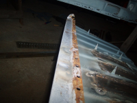 P1017348.jpg (65.41 KB. 733x550 - vist 466 ganger.) So kappa eg nede, frå vegg til vegg so langt som råd. Resten brukte eg stikksag-blad til å skjera heilt inntil innerskjermane på sido. Legg merke til deformeringane i kappsaumen. Sveisespenningane som har herja med platene..