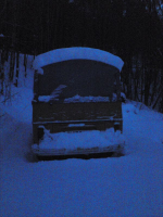 Det meste av snøen på en halv meter hadde blåst bort i stormen ( og ut på veien ) da jeg våget meg utendørs igjen for å se hvordan det stod til med bobla, og knipse et bilde av stakkaren. Ser litt ubarbert ut der den står, med noe rask fra vinden på seg, hehe. Var akkurat en dag for sent ute med biltransporter-organisering, og fikk da ikke frakta 03`n bort til det nye mekkelokalet før vinteren kom for alvor og alle veiene befant seg i unntakstilstand. All snøen som kom før Jul regna bort, og det var helt bare veier et par dager, så det så lyst ut ei stund, men nå snør det godt igjen i pølselandet også. Global oppvarming? Hvor!?