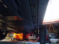 Så prøvde eg litt,, ja det skulle gå dette her, og snart var bunnplata komt under bilen og bilen/karosseriet var oppi lufta og på bokk. Såvart bunnplata lina og lodda 100% opp under karosseriet. og karosseriet vart vatra opp nøyaktig til 0. På den måten kunne eg plassera kanalbunnen på karosseriet og bruka lodd for å sjekka kor skruehola traff botnplata. På den måten sparte eg all den vanskelege løftinga av karosseriet!