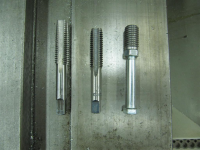 Når borringen var utført var det på tide å begynne gjengingen. Like selvsagt som at borringen blir 90 grader på anleggsflaten i begge akser er det også at Gjengingen blir det! Derfor skal vi ikke bevege oss helt fra søyleborremaskinen ennå. Først litt om gjengetapper: For dette formålet brukte jeg to typer tapper: "Mellomtapp" (v. side) for å få en myk start på oppgjengingen av hullet. Deretter "bunntapp" (midten) for å få gjenget lengst mulig ned i de hullene som ikke gikk tvers igjennom. Den siste duppeditten helt til høyre på bildet var en enkel M8-bolt og en mutter for å låse fast den påskrudde casesaceren. Denne saken brukte jeg til å installere casesaverne når tiden var inne.