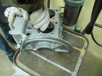 Jeg la blokka, 100% fri for studs, ned på fjøla til en søyleborremaskin og sentrerte borret mot hvert hull før jeg begynte å borre. Idet borret treffer hullet når borret sviver vil den siste litte sentreringen inntreffe. Pass på at du derfor ikke spenner blokka helt fast, men kunne holder den fast mot fjøla. Selve borringen gjorde jeg på temmelig lavt turtall og med en rolig mating på borret. Vi forhaster oss ikke når vi bygger motor!