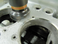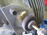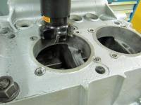 Jeg starter med å såvidt plane over den øverste kjøleribba. Dette gjør jeg for at de halvmåneformede (styre?)tappene rundt syl.-hullet skal jevnes vekk og at jeg får en glatt og jevn overflate som utganspunkt. Jeg tar ikke mer enn akkurat nødvendig for at toppen av ribba skal bli jevn. Det er ikke om å gjøre å fjærne gods for dette bygget da forbrenningskammerne ikke skal planes ned mye.