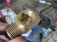 Her bruker jeg en 90-graders 3/8 NPT-fitting som blir frisert i kantene for å muliggjøre innskruinga i blokka, som i tillegg blir frisert en smule.