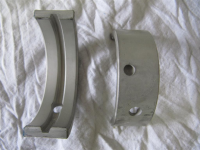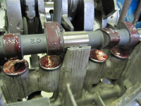 Har du forsikret deg om at alle styrepinnene står i lagerbukkene? Har du greid å sette alle lagerne med styrepinnehullet pekende MOT svinghjulet, så vil du IKKE oppleve problemer. Nå skal du forsikre deg om at du tar det pent og forsiktig. Ikke bruk for mye makt, og sørg for at styrepinnehullet står på riktig plass ved å rotere lagerene til det stemmer. Noe kraft må ofte til får å presse veiva nedi hvis blokka er linjeborret. Lageret er ofte 0,05mm større i ytre diameter enn selve lagerbukkens nye nullmål. Når det gjelder det delte midlre lageret pleier jeg å kun sette dette nedi blokkhalvdelen som står i bukken. Det andre blir liggende på benken foreløpig. Nå kommer nemlig trikset: