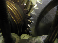 Så slenger jeg kammen nedi og setter registeret riktig. Husker du prikkene på drevene?