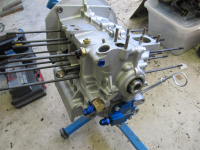 Nå gjenstår det bare å få presset inn de nye ventilstyringene og få disse slipt "flush" med portene. Så kan endelig toppene og ventilene leveres til sliping. Jeg har fått bestillt nye råder, så de er på vei. Jeg tenkte som så at når rubbel og bit i motoren ellers er nytt, så kan en like godt kjøpe nye råder også. Baktanken var naturlgvis at disse har ARP-bolter og nye foringer til krysspinnene. I tillegg er de "shot-peened", kort fortalt behandlet for overflatespenninger.