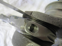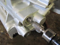 Her bruker jeg en 90-graders 3/8 NPT-fitting som blir frisert i kantene for å muliggjøre innskruinga i blokka, som i tillegg blir frisert en smule.