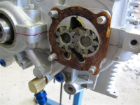 En detalj er oljepumpa. For at du skal slippe å presse/banke denne inn i blokka, kan det være en idé å dytte denne inn før alt blir torquet sammen.