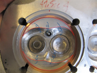 Toppene er ferdig bearbeidet, og volumet i forbrenningskammerene har blitt satt til 41,5 ml. = kompforhold på ca. 10,6:1 @ 1,25mm vendehøyde.