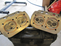 Kommet noe lengre. Oppstart nærmer seg. Toppene er ferdig bearbeidet, og volumet i forbrenningskammerene har blitt satt til 41,5 ml. = kompforhold på ca. 10,6:1 @ 1,25mm vendehøyde. Tips: Bruk en vekt m. 0,1g-oppløsning sammen med den vanlige spøryta. 1 gram vann = 1 ml. Jeg har snakket litt om squish-området tidligere, og tenkte jeg kunne nevne noe om hvorfor dette er verdt å reflektere litt rundt: Innledningsvis må det sies at vi som bygger på T1/T4-topper har mye av dette gratis ut av esken. Ved å ha et flatt og tight område i forbrenningskammeret der stempelet har liten klaring (avhengig av vendehøyde), gis stempelet muligheten til å presse gassen inn mot senter av forbrenningskammeret ila. kompresjonstakten. Med dette kommer det noen goder vi ønsker å trekke nytte av når vi skal oppnå god effektivitet: Når gassen presses hurtig inn mot senter over det trange squish-området, oppnår vi at gassens flow blir turbulent. Dette gir oss god mix og en mer uniform blanding = jevnere og mer effektiv forbrenning. Er det noen som begynner å trekke paraleller til innsugsdiskusjonen ennå?