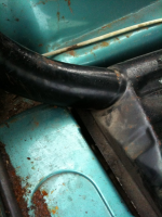 Trur ikkje det er noko lurt å bygga opp tanken sånn, Det sprutar jo drit inn og no.. skal jo tetta rundt kanten der. Men har du tilgang på vinkelslipar og sveis, so fiksar du den kanten enkelt, ellers kan du gjera da på ein stygg måte med hammar, og banka inn kanten til du får tanken ned... men då må du retta opp/sveisa der eingong i framtida og, om du skal ha inn ein orginal tank(som jo er det enklaste.. nemlig å skaffa og montera org tank)
