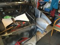 Her hopper jeg litt lenger frem. Eneste som blir brukt av reprodeler på bilen er kanaler, bunn av reservehjulsbrønnen og nedre del av A-stolpen. Hvis jeg ikke husker helt feil gikk det vel med litt reproblikk i bunnen av B-stolpene også. Resten er restaurert blikk fra ulike donorer.