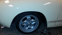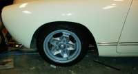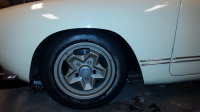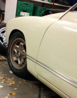 neste forsøk i søken etter det perfekte hjul-oppsettet gikk ut på å prøve et sett 165/50 på 6" felgene foran, og de er betraktelig lavere enn 175/70, men kanskje i minste laget. Jeg fikk den ikke lavere enn på bildet, da jekken står under (har ikke fjærpakkene montert i forstillinga enda), men utseendemessig kunne den vært litt lavere, men da tror jeg den blir for lav både i forhold til bakkeklaring og vinkel på bærearmene: