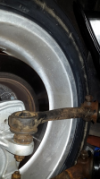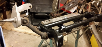 Neste var å krabbe under bilen og så fikk jeg startet med å demontere forstillinga som sitter der, og det er ikke så mye å ta bilde av, men selv om alt er forholdsvis nytt og rent, så er det en del banning, banking og knoting allikevel. Bremsene er av, og det samme er styrestag og styresnekke. Neste er å få litt hjelp slik at jeg kan få senket den gamle forstillinga ned, og løftet opp den nye, så får jeg se hvordan dette tar seg ut.