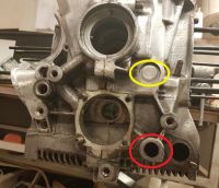 Da har jeg begynt å rengjøre, og jeg har fjernet de pluggene jeg satt i oljekanalene, men et par av de er så store at jeg hadde ikke plugger. Er det noen som vet hvor store jeg trenger, og hvor jeg kan får tak i plugger og evt gjengetapper? Både den rød- og gulmarkerte på bildet ønsker jeg å sette i plugger i: