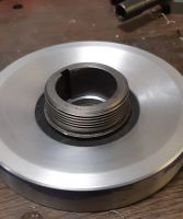 Varme funket som et skudd, så da fikk jeg separert delene og maskinert siste biten før jeg tenkte å montere stål-navet fast i alu-hjulet med 8 skruer, og så maskinere sporene til reima og fremsiden av reimhjulet. Her er et par bilder fra dreiebenken og ferdig bakside.