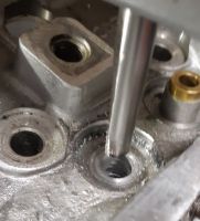 valve.jpg (33.86 KB. 291x600 - vist 469 ganger.) Jeg er ikke noen ekspert på dette, men det ser for meg ut som det er en en del koksavleiringer; speielt på innsugsventilen. Vi gjorde noen forsøk på å måle ventilstammen og ut fra det lille vi testet så kom vi til 7.96mm og specen sier 7.9 til 7.94, så de er ikke for tynne i alle fall. Jeg har nye (litt brukte) ventiler liggende og en ny styring på vei i posten som er 15mm utvendig, så planen er å renske opp hullet i toppen etter beste evne, og dreie ned styringa til presspasning og montere dette sammen igjen. Så da har jeg forhåpentligvis en frisk 2110 oxyboxer og en 1600 kompressormotor klar til våren