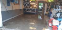 Og så bråbestemte vi oss for å ta en skikkelig sjau i garasjen igjen, og begynte med å tømme ene halvdelen av garasjen for å legge litt maling på betongen. Her har vi gått på med litt saltsyre for å forhåpentligvis få et underlag som epoxyen biter i: