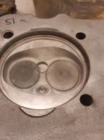 Disse toppene har en kant ytterst, der sylindrene ligger an, så vi må begynne med å frese bort den for å få bra "squish area", men vi må nok litt dypere. Må ha rundt 46cc i forbrenningskammeret for å treffe 8.5:1.