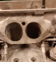 Så har jeg grublet litt på hvordan jeg skal tette kanalen opp til mail gallery i blokka, siden jeg skal kjøre full-flow på denne motoren også, og endte opp med å dreie en alu-plugg ca 4 hundredeler overdim, som vi presset (banket) inn i hullet i pumpa, så lar vi blokka være som den er i dette området.