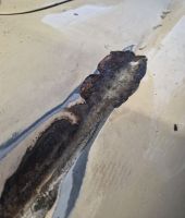 Det ser jo ikke spesielt bra ut, og mest sannsynlig har det kommet fukt innunder lakken og liggert der og godgjort seg et par år. Det var ikke mye sparkel på dette området; kanskje bare maks 1mm tykkelse inkl grunning og lakk.