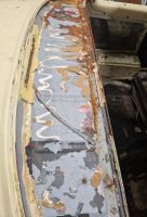 Det var en del gunk i falsene hvor motorluke- og panserpakningene var limt på, så jeg tok en runde med stålbørsten og når jeg var i gang rensket jeg opp under bakrutelista også.