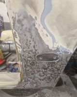 20241214_113224.jpg (32.69 KB. 411x600 - vist 688 ganger.) Men mye bedre enn sist. Det er også flere lave områder; bla oppe til høyre for emblemet. Så her må nok hammer og mothold frem for å massere litt før det blir helt bra. Men det blir etter at døra er fikset og hengt på igjen. Så da var det bare å flytte fokus over på noe annet, og da fjernet jeg en del asfaltmatter som satt på veggene (innerskjermene) i "frunken". Som man kan se dro jeg med litt av lakken, så når resten av lyddempingen er fjernet må jeg nok i gang med en grisejobb og fjerne lakk og understellsmasse oppi her også. Håper på bra vær i vinter så jeg kan stå ute med det.