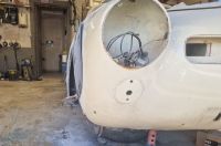Jeg kikket litt mer på denne forkanten av forskjermen, og kom til at siden jeg skal bytte en del av hjulbuen, kan jeg legge et par snitt i skjermen, og forsøke å dra skjermen litt ut i forkant. Her er et bilde etter et par prøve-"drag", og jeg tror det skal la seg gjøre å få den enda litt lenger ut i bunn. Jeg la ut et spm på en ghia-side på FB, og fikk noen bilder på urørte biler, som jeg bruker som referanse.