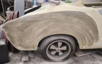 Og så fyra jeg opp vinkelsliper og sveiseapparat igjen, for å prøve å rette opp de siste detaljene på denne umulige forskjermen. Jeg brukte også litt glassfibersparkel i hjulåpningen for å sikre at det ikke går skall av akkurat på hjørnene. :