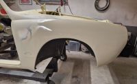 Og når den kom inn i garasjen igjen så la jeg på et lag med 2k-epoxy på skjermen for å sjekke at hjulbuen ser ok ut før jeg skal legge på hele bilen. Mye lettere å se når alt har samme farge:
