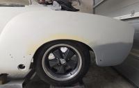 Hjelper når dørene er på og alt har samme farge. Mens jeg venter på at Atle skal få sveiset ferdig, skal jeg forberede til å legge på slipegrunning, og siden jeg har litt begrenset med plass henger jeg på dører, panser og motorluke. Det ideelle ville vært å ta alt hver for seg, men da får jeg heller maskere litt ekstra.