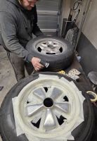 Utfordringen er at bakfelgene (de jeg har testet på her) er nyere 7" mens forfelgene er eldre deep6, så på 7-tommerne er det en skråkant, (den som er lakkert gull på forrige versjon) mellom eikene og ut til selve felgkanten, så eikene er kortere på 7-tommerne. De fleste merker ikke det, men det gjør jeg, så jeg skal prøve å finne en løsning som minimaliserer den effekten.