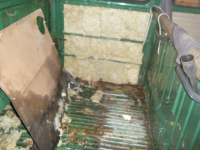 Gravrust i kroken på golvet + noko langs gulvkanten på hjulkasso.