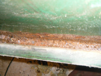 Ruto var lettare most nedi kanten akkuratt der den verste gravrusta var. Ser ut som rusta faktisk har sprengt ruto. (Nei det er ikkje eg som har traspa ho..) Satsar på å gjenbruka ruto, sjølv om ho kanskje bør bytast etterkvart, den er orginal. men eg har ikkje studert kor bra ho er.