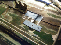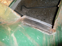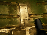 close upp frå eine hjørna: Bak plato ser me den vetle falsen som tilhøyrer fremste del av planet. Så skal planet skiftast 100% må den her plata av for å komma til. Og da e lika greitt fø da e mykje drit som skjuler seg rundtomrking her(+ att plata er bra herja(