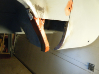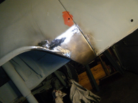 prøving av klokkerholmen.. platetjukkelsen er nesten god nok, grunninga er bås og passformen er relativt dårleg, men fungerar utan so mykje modifisering.  og eit anna minus: den er litt vel avrunda i kanten inn mot karosseriskjøyten so det har lett for å verta glippa der. orginalen er heilt 90 grader i kanten og dermed tett skjøyt.. litt banking so hjelper da