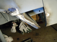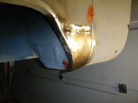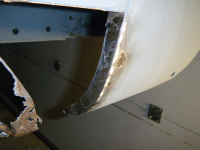 prøving av klokkerholmen.. platetjukkelsen er nesten god nok, grunninga er bås og passformen er relativt dårleg, men fungerar utan so mykje modifisering.  og eit anna minus: den er litt vel avrunda i kanten inn mot karosseriskjøyten so det har lett for å verta glippa der. orginalen er heilt 90 grader i kanten og dermed tett skjøyt.. litt banking so hjelper da
