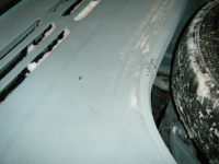 DSCF3837.jpg (110.84 KB. 733x550 - vist 478 ganger.) prøving av klokkerholmen.. platetjukkelsen er nesten god nok, grunninga er bås og passformen er relativt dårleg, men fungerar utan so mykje modifisering. og eit anna minus: den er litt vel avrunda i kanten inn mot karosseriskjøyten so det har lett for å verta glippa der. orginalen er heilt 90 grader i kanten og dermed tett skjøyt.. litt banking so hjelper da