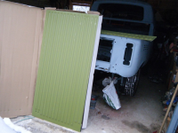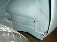 prøving av klokkerholmen.. platetjukkelsen er nesten god nok, grunninga er bås og passformen er relativt dårleg, men fungerar utan so mykje modifisering.  og eit anna minus: den er litt vel avrunda i kanten inn mot karosseriskjøyten so det har lett for å verta glippa der. orginalen er heilt 90 grader i kanten og dermed tett skjøyt.. litt banking so hjelper da