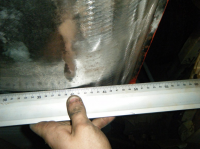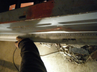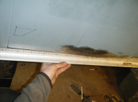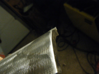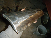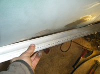 Eg klarar jo aldri å få gjort nok iløp av dagane  ikkje idag heller. hadde ein plan om å få på den kanalen idag men det sidepanelet har satt meg på ein solid krympe prøve.. heile panelet er/var totalt føkkt øpp med bulker innover og utover i mente. mykkkkje banking og javningog masssssse krymping med krympedisc deretter blåselampe og so krympedisk igjen har gjort til at eg klarte å få da omtrent so godt som eg kan utan å ha sveist på kanalen. til å begynna med var heile kanten blaut som ein slapp gitarstreng mens no er det faktisk motstand i stålet igjen! Mykkje meir solid, så har no ivertfall fått vekk einheil del av det strekte stålet.. brukte fleire timar på dette men fekk begynt på kanalen og. mykje tenking og tilpassing når ingenting går som det skal... nokon halvdårlege bilder etter gammalt Her er eit bilde som viser litt kor mykje strekt stålet var. dette er ogso etter att eg har krympa massse der da e blankt