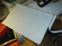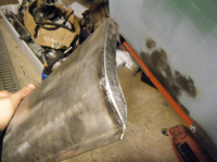 Eg klarar jo aldri å få gjort nok iløp av dagane  ikkje idag heller. hadde ein plan om å få på den kanalen idag men det sidepanelet har satt meg på ein solid krympe prøve.. heile panelet er/var totalt føkkt øpp med bulker innover og utover i mente. mykkkkje banking og javningog masssssse krymping med krympedisc deretter blåselampe og so krympedisk igjen har gjort til at eg klarte å få da omtrent so godt som eg kan utan å ha sveist på kanalen. til å begynna med var heile kanten blaut som ein slapp gitarstreng mens no er det faktisk motstand i stålet igjen! Mykkje meir solid, så har no ivertfall fått vekk einheil del av det strekte stålet.. brukte fleire timar på dette men fekk begynt på kanalen og. mykje tenking og tilpassing når ingenting går som det skal... nokon halvdårlege bilder etter gammalt Her er eit bilde som viser litt kor mykje strekt stålet var. dette er ogso etter att eg har krympa massse der da e blankt