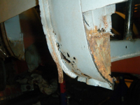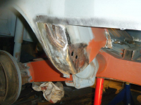 DSCF2703.jpg (82.34 KB. 640x480 - vist 456 ganger.) Innerskjermen har gravrust eit stykke oppøve + spreng rust i platefalsen, så da må nytt stål på fleire av delane her. og botnen av kanalen til dogleggen har jo eit stort hol som de ser so dar må da lappast litt og