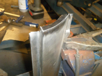 om du tenker på å låsa fast endane av plato når eg bankar ned, so endte eg opp med nettopp da, fordi den ikkje ville krympa skikkelig når eg berre banka dei ned uten å ha låst plato. neste gong skal eg prøva ein nylonhammar eg har, og slå mot tre. ser på div metalshaping forum att dei fleste som krymper plater gjer da på den måten, for å ungå å strekke.