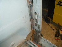 fekk fortsatt idag med døropningen. greitt å bruka litt tid på å få detta på stell no når da faktisk er mulig å regulera på da! etter å ha kappa opp den sveisen mellom d-stolpen og innerkanal og den forsterkingen bak, so fekk eg jekka opp igjen der den hadde sege ned, som nevnt tidligare. men den var fortsatt for vid i bunn av døropningen i forhånd til oppe med taket, men etter å ha rigga meg opp med ein strekkfisk fekk eg strekt da på plass. legg merke til pylso i døre VS pylso på karosseriet..